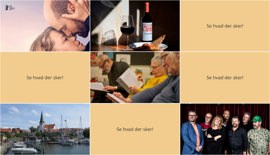 I næste uge kan du opleve alt fra et rørende kærlighedsdrama i Rønne Bio, nostalgisk valgflæsk-buffet hos Skafferiet, til fællesskab ved guidet fælleslæsning på biblioteket. Du kan også deltage i en caféaften med samtale om efterladtes sorg eller danse til tonerne fra 80'erne i Musikhuzet. Læs med, og find ud af, hvordan du deltager i disse aktiviteter.